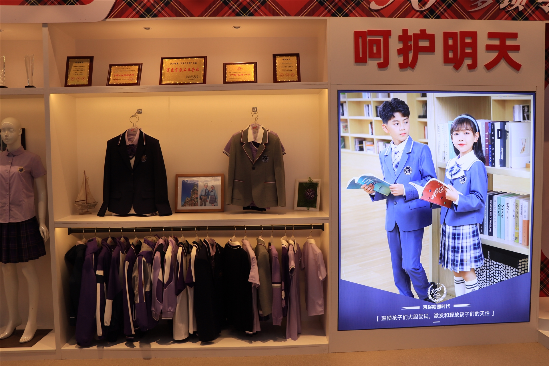 品牌館展示了百裕集團旗下百裕校園時(shí)代、喬派恩、愛(ài)樂(lè )學(xué)等品牌服飾經(jīng)典款,不同的區域裝飾風(fēng)格展現不同的品牌個(gè)性與文化,可滿(mǎn)足靜態(tài)與動(dòng)態(tài)不同形式的展示方式。