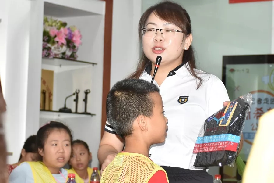 (新希望公司副總經(jīng)理莫麗江經(jīng)理為小記者們講解防偽標識)