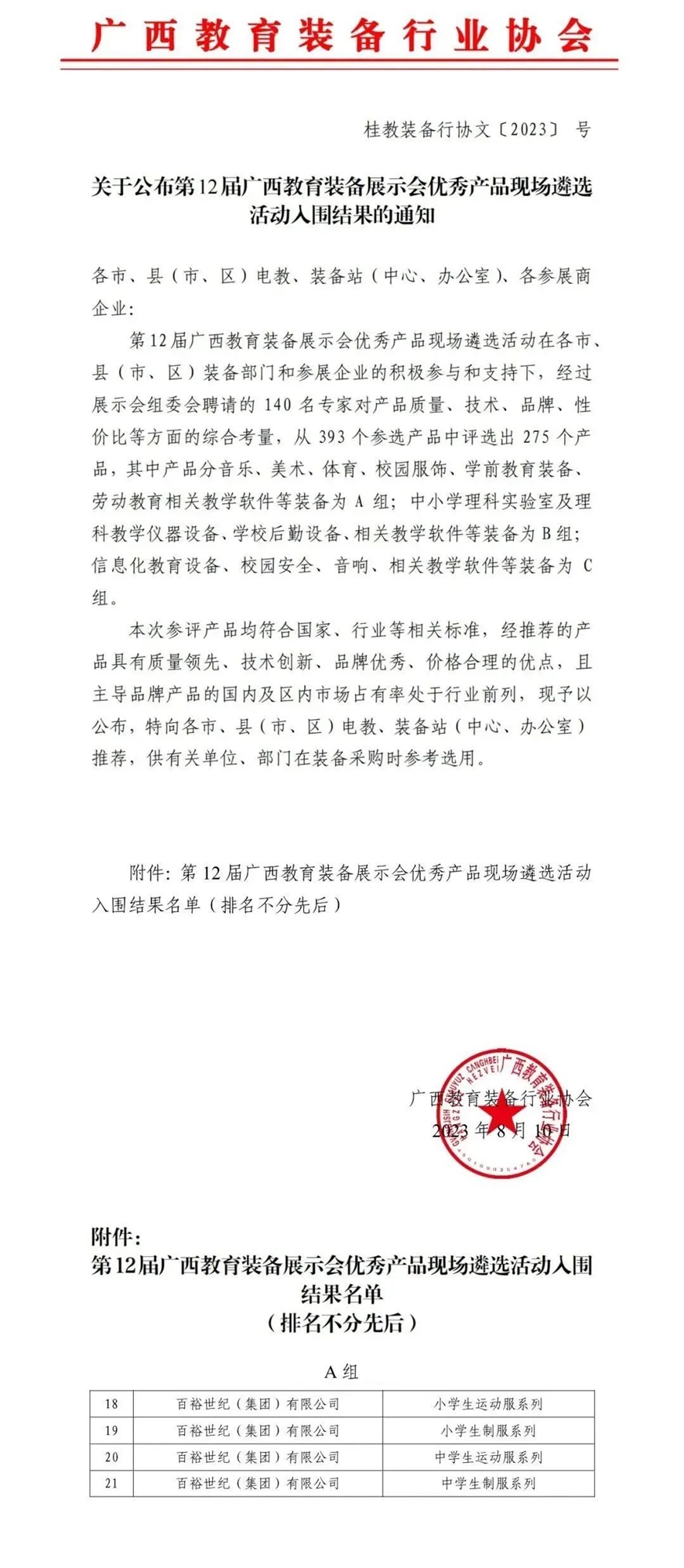 百裕世紀(集團)有限公司的4個(gè)校園服飾作品成功入選第12屆廣西教育裝備展示會(huì )優(yōu)秀產(chǎn)品推薦目錄,分別是小學(xué)生運動(dòng)服系列、小學(xué)生制服系列、中學(xué)生運動(dòng)服系列、中學(xué)生制服系列。