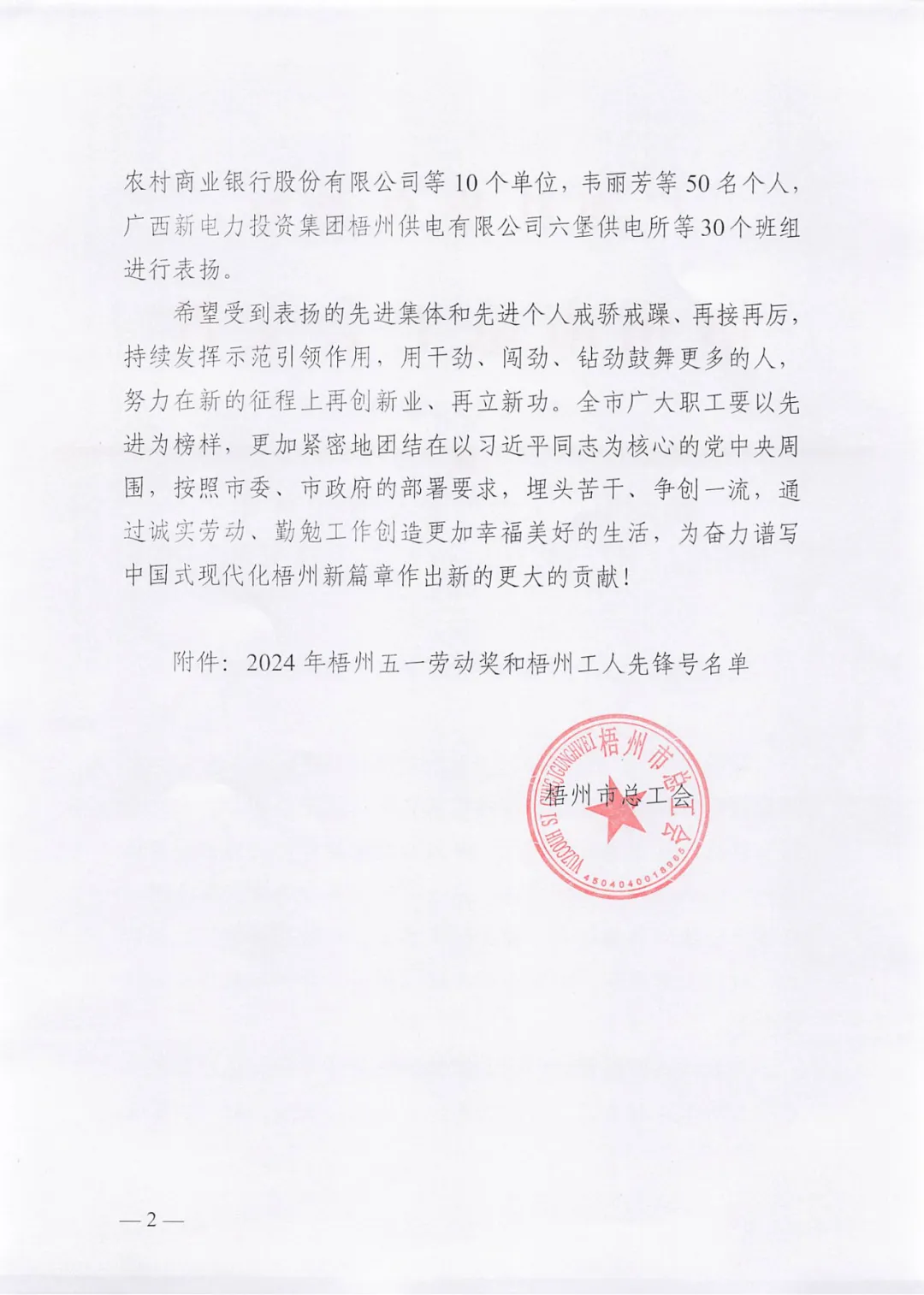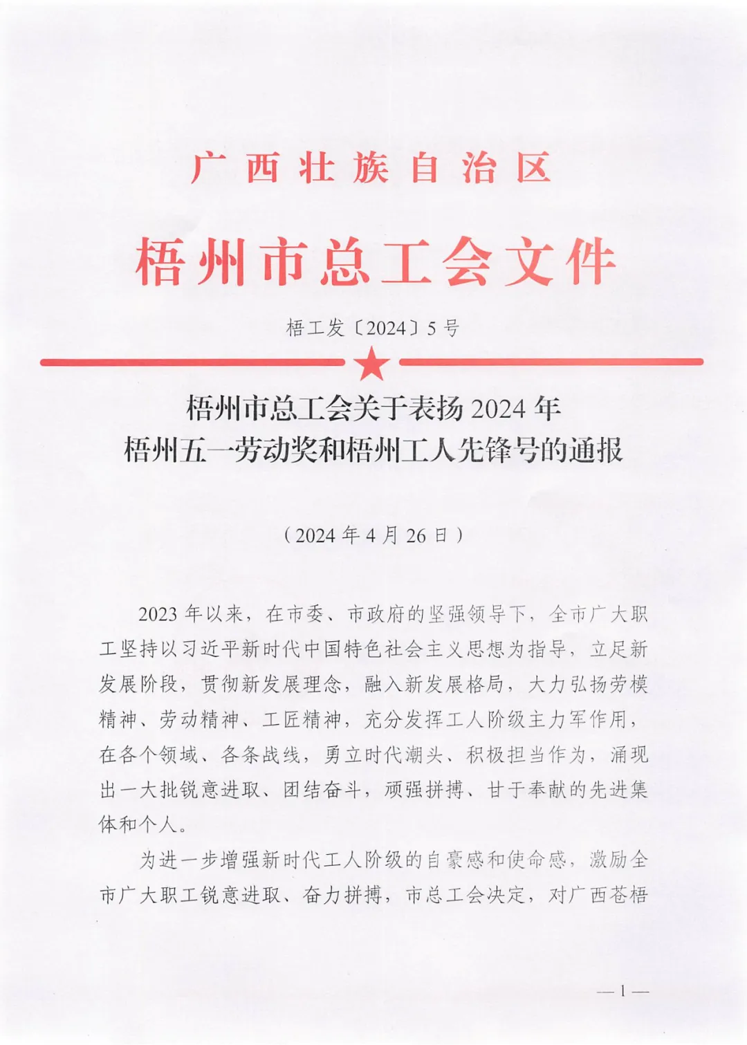 4月26日,梧州市總工會(huì )印發(fā)《梧州市總工會(huì )關(guān)于表?yè)P2024年梧州五一勞動(dòng)獎和梧州工人先鋒號的通報》,百裕世紀(集團)有限公司羅獻鳳同志榮獲2024年“梧州五一勞動(dòng)獎?wù)隆薄?/span>