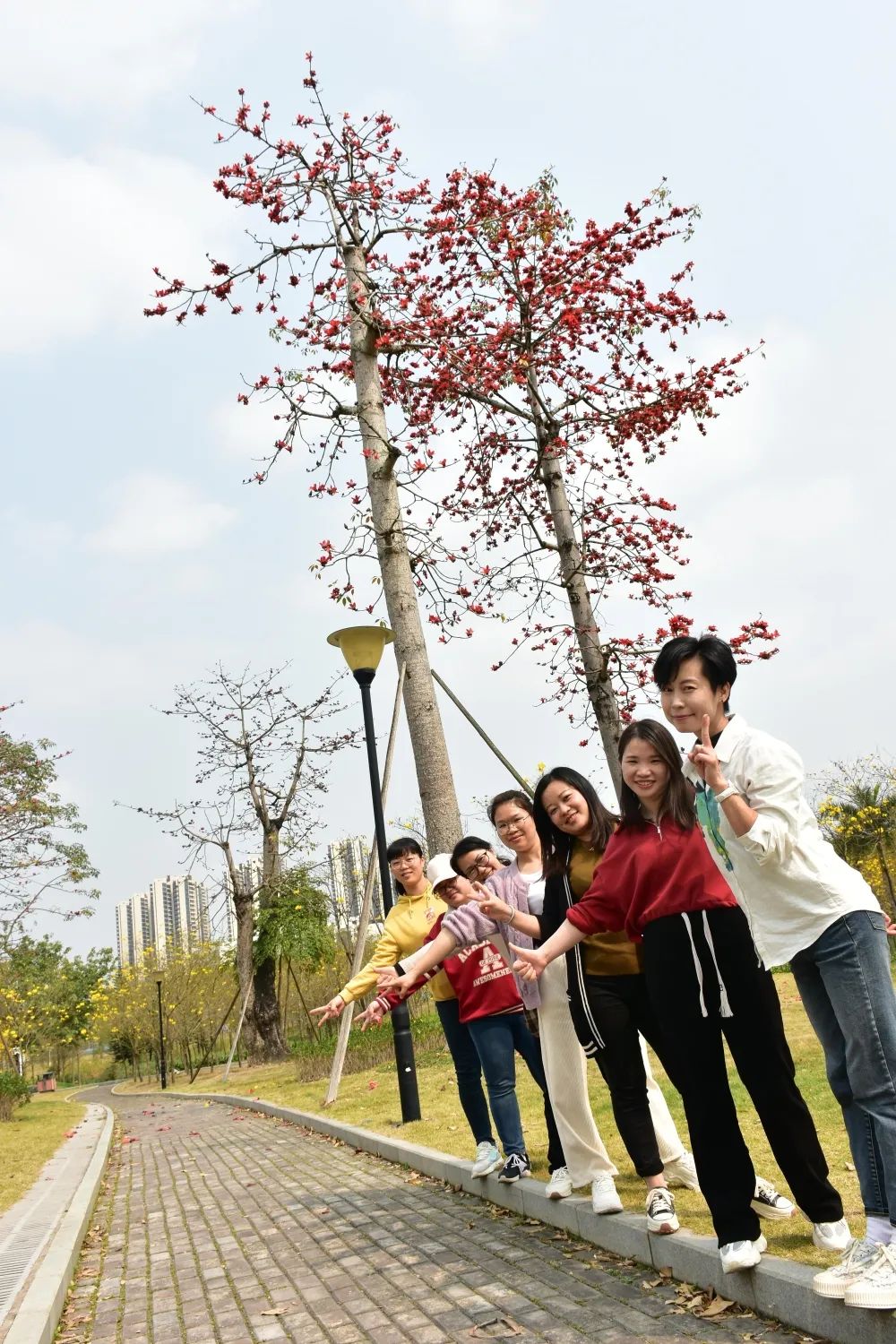 江南公園里黃風(fēng)鈴花金黃一片,靈動(dòng)美麗!桃花嬌艷欲滴、木棉花不像一般花草必須貼近才可欣賞,聳立在高枝上的她,不論遠近,望過(guò)去,都是一副美麗的景象。